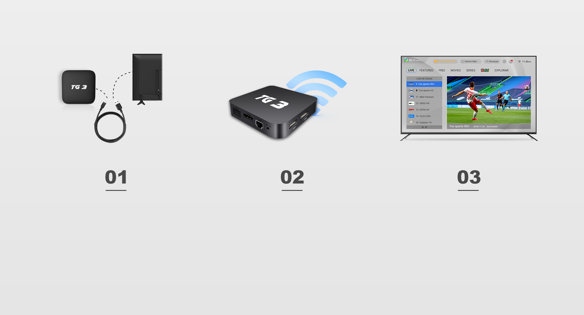 TV pelo cabo HDMI (incluído na box)